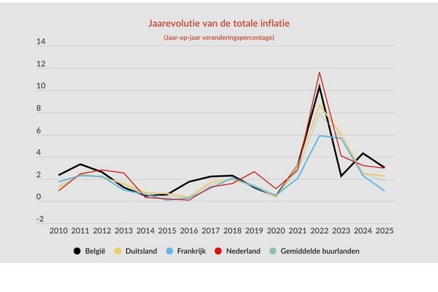 De totale inflatie in België lag hoger dan in Duitsland (2,3%) en Frankrijk (0,9%), terwijl Nederland dezelfde inflatie kende als België. Het verschil met Frankrijk en Duitsland is vooral te verklaren door hogere energieprijzen in België.