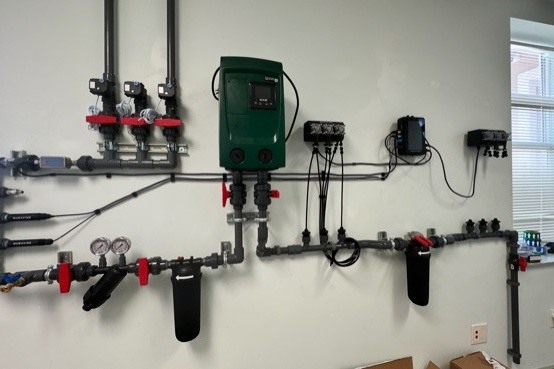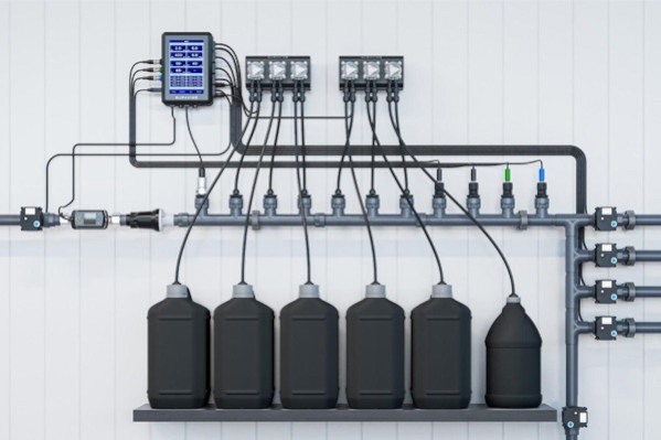 Een van die functies is inline dosering. In plaats van een grote batch voedingsoplossing in een mengtank te bereiden, worden water en meststoffen hierbij in real time gemengd terwijl het water door het systeem stroomt.