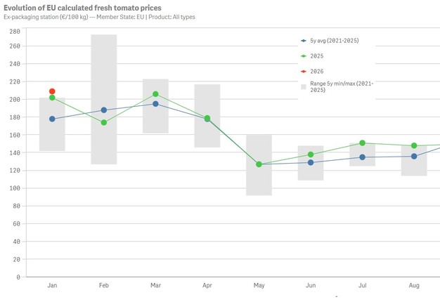 De gemiddelde tomatenprijs in januari 2026 in de Europese Unie lag net iets hoger dan de recordprijs van januari 2025. 2,09 euro werd er gemiddeld voor een kilo tomaten betaald, zo blijkt uit een update van het tomatendashboard van de Europese Commissie.