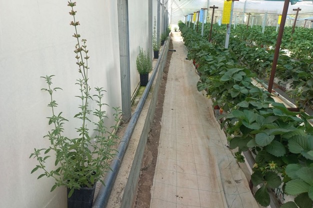 Een belangrijk onderdeel van de proeven op Claros Farm was de strategische plaatsing van aromatische planten onder de teeltgoten en langs de kasranden.