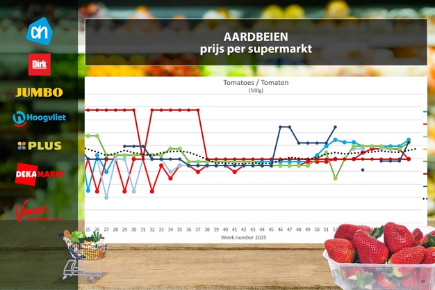 Prijsdata zijn afkomstig van Supermarktscanner.nl en gebaseerd op de online prijzen in de webwinkels van Albert Heijn, Jumbo, Plus, DekaMarkt, Dirk en Hoogvliet. De prijs is een gemiddelde, inclusief de promoties. In deze prijsvergelijking zijn herkomst en kwaliteit niet meegenomen. De meeste supermarkten vermelden deze gegevens niet op hun website. Jumbo verkoopt alleen verpakte trostomaten per 5 stuks in plaats van per 500 g of kilo.