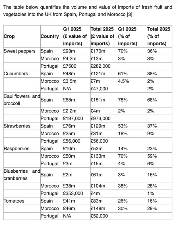Ongeveer twee vijfde van het voedsel dat in het Verenigd Koninkrijk wordt geconsumeerd, is afkomstig uit het buitenland. De importwaarde uit Spanje, Portugal en Marokko bedroeg £5,4 miljard. Onder de dertig belangrijkste ingevoerde voedingsmiddelen bevonden zich voor meer dan £500 miljoen aan tomaten, paprika's en komkommers, en bijna £500 miljoen aan aardbeien, frambozen en ander zachtfruit. Daarnaast werd voor ruim £150 miljoen aan bloemkool en broccoli ingevoerd. Deze producten worden in deze periode van het jaar doorgaans niet in het Verenigd Koninkrijk geteeld, waardoor sprake is van een seizoensgebonden afhankelijkheid van buitenlandse aanvoer.