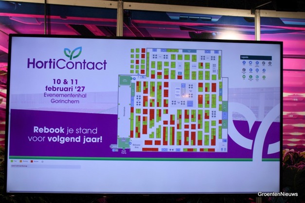 De beursopzet van volgend jaar, met als vernieuwing een nieuwe rechtstreekse doorsteek van ingang naar de kenmerkende roltrap en een meer verspreid horecaconcept. HortiContact 2027 keert terug op 10 en 11 februari 2027, daags na carnaval en Fruit Logistica. De groene vakjes waren donderdagmiddag nog vrij, dus wie een mooi plekje wil claimen, moet er snel bij zijn.