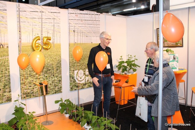 Globe Plant bestaat 65 jaar. Henk van Dam in gesprek met twee beursbezoekers die misschien nog wel net iets ouder zijn dan de plantenkwekerij van Voorne-Putten? Als het goed is gingen zij aan het eind van de beurs met de verse planten uit de stand van Globe Plant naar huis. De 'onderhandelingen' zijn hier volop gaande.