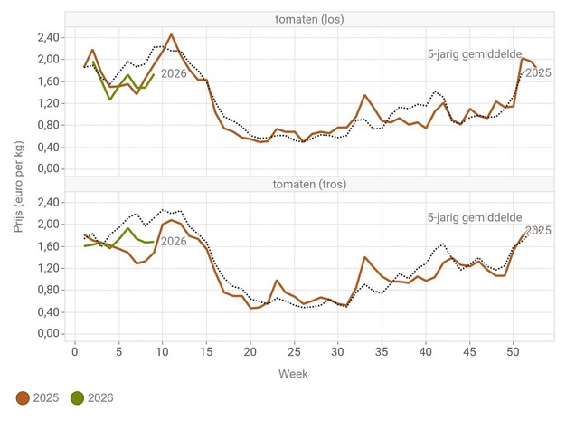 Met een gemiddelde kiloprijs van 1,74 euro per kilo werden losse tomaten op de veilingen van het Verbond van Belgische Tuinbouwcoöperaties in week 9 beter betaald dan trostomaten. De middenprijs voor trostomaten kwam aan het eind van week 9 uit op 1,69 euro per kilo. De middenprijs voor losse tomaten begon vorig jaar rond deze tijd ook flink te stijgen. Afgelopen week bleef het prijsniveau hier nog wat achter bij 2025. De prijzen voor trostomaten lagen juist iets hoger dan in week 9 in 2025.