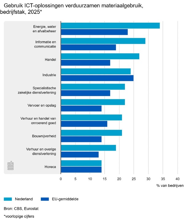 In 2025 gaf 23 procent van de bedrijven aan ICT-oplossingen te gebruiken om het materiaalgebruik te verduurzamen. Deze bedrijven gebruiken bijvoorbeeld software om materiaalverspilling tegen te gaan of voor het automatisch sorteren van afval. Hiermee staat Nederland op de vierde plaats binnen de EU. Ook zorgt 90 procent van de bedrijven voor verantwoorde afvoer van oude ICT-apparatuur, waarmee Nederland op de tweede plaats komt binnen de EU. Dit blijkt uit de nieuwste cijfers over ICT-gebruik bij bedrijven van het Centraal Bureau voor de statistiek (CBS) en Eurostat.