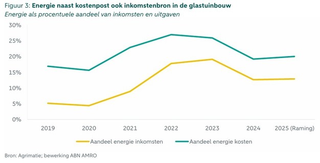 In de glastuinbouw (groente- en sierteelt) schommelen uitgaven aan energie tussen de 15 tot 25 procent van de totale kosten. De sector hanteert doorgaans een professionele energiebeheerstrategie met een mix van energiecontracten, aldus ABN AMRO. Hierdoor werken prijsstijgingen geleidelijk en met vertraging door in de bedrijfsresultaten.