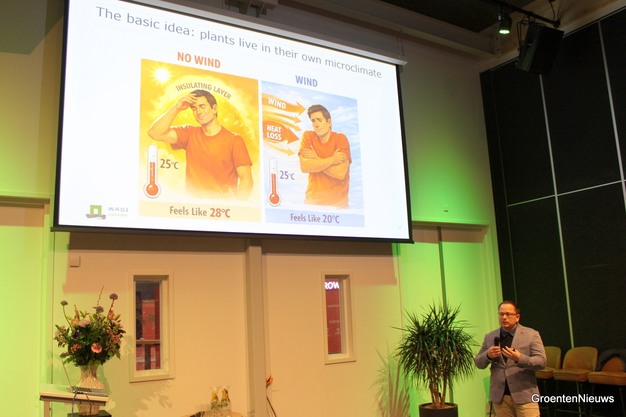 De assistent-professor van Wageningen University & Research roept de zaal op luchtbeweging in te gaan zetten als sturingstool in de teelt. Luchtbeweging moet je tactisch inzetten, bijvoorbeeld door CO₂ die telers doseren goed door de kas te verspreiden.