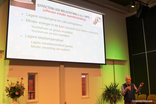 Net als Ton tijdens het presenteren van zijn 10-stappenplan slaat ook Erik Stappers na de korte pauze de brug naar de praktijk. Erik werkte voor een LED-leverancier en is tegenwoordig teeltadviseur bij Horti-Consult International. Hij deelt met de zaal zijn praktijkervaringen over de LED-teelt, en bespreekt specifiek ook zijn ervaringen uit teelten van afgelopen winter. De grootste uitdaging die hij ziet, is het omzetten van suikers in productie, oftewel het naar de vruchten krijgen van assimilaten.