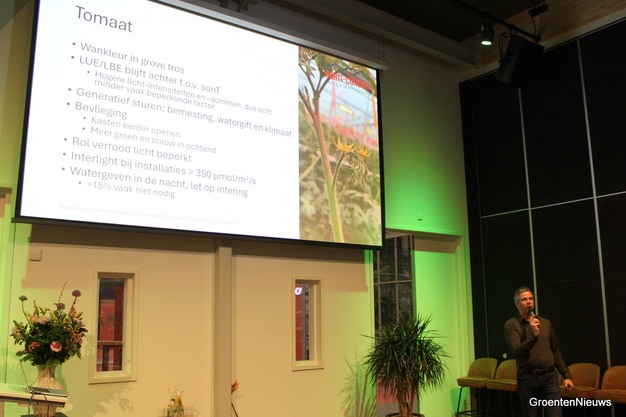 Specifiek in de belichte tomatenteelt blijft wankleur een zorgenpunt. Bovendien valt op dat de lichtbenuttingsefficiëntie achterblijft. Tijdens de paneldiscussie aan het slot van de avond gaan de sprekers, aangevuld met de ervaren tomatenteler Dennis van Wingerden, op zoek naar mogelijke oorzaken voor beide problemen. Verticale temperatuurverdeling en luchtbeweging worden genoemd als aandachtspunten.
