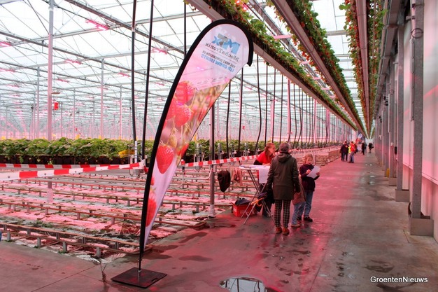 Tholen - "Papa, hoe plukken ze die aardbeien daar?" Een van de jonge bezoekers die zaterdagochtend de kas van Royal Berry in Egchel instapt, wijst naar de goten ver boven zijn hoofd. Op de plek waar vorig jaar nog komkommers en paprika's werden geoogst, groeien nu volop aardbeien. De belichting staat aan. De oogst is in volle gang.