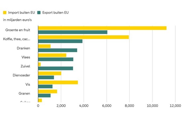 Figuur 1: Handel met landen buiten de EU wordt relatief hard geraakt door hogere containerprijzen.Totale invoer- en uitvoerwaarde buiten de EU per productgroep (2024)