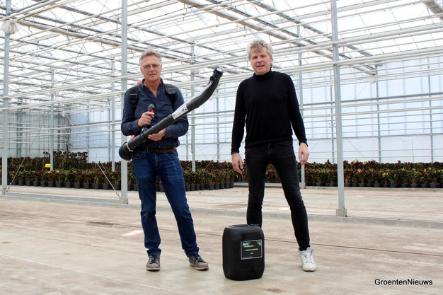 Op een zonnige donderdag medio maart treffen we Koos en uitvinder Jaap van der Spek in Pijnacker. Ze zijn bij Ammerlaan The Green Innovator om een nieuw stuk kas te coaten. "Dit doen we om de unieke werking te demonstreren, niet om te testen", benadrukt Koos. "Testen hebben we al heel veel gedaan. De techniek is uitgebreid wetenschappelijk beschreven."