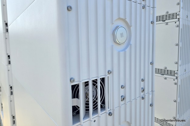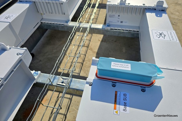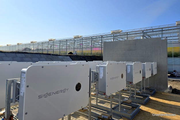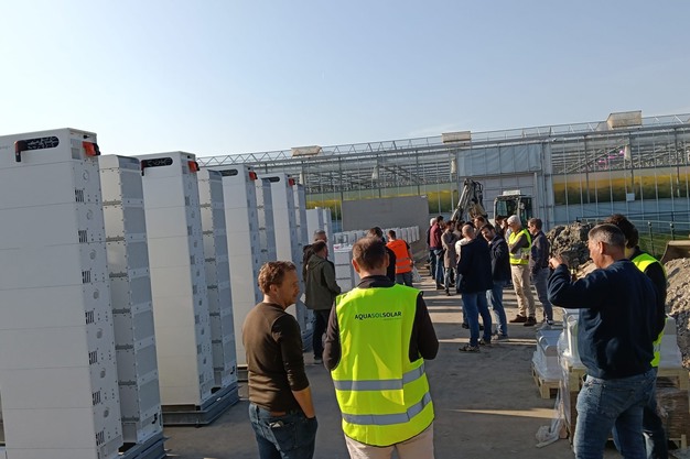 Tijdens tuinbouwbeurs HortiContact werd het project officieel verkocht. Teler Stefan Oussoren kwam naar Gorinchem om de hand te schudden van Atakan Bilecen, van batterijleverancier Sigenergy. Stefan was afgelopen najaar een van de deelnemers aan de door Aquasol Solar georganiseerde Energie Roadshow. Hij zag bij een collegateler destijds het stack-batterijsysteem voor het eerst. Wat hem opviel, was hoe stil de batterij was. Dat sprak hem aan, vertelt hij donderdagmiddag terwijl zijn collega's en andere geïnteresseerden rondom het batterijsysteem in opbouw een bakkie doen.