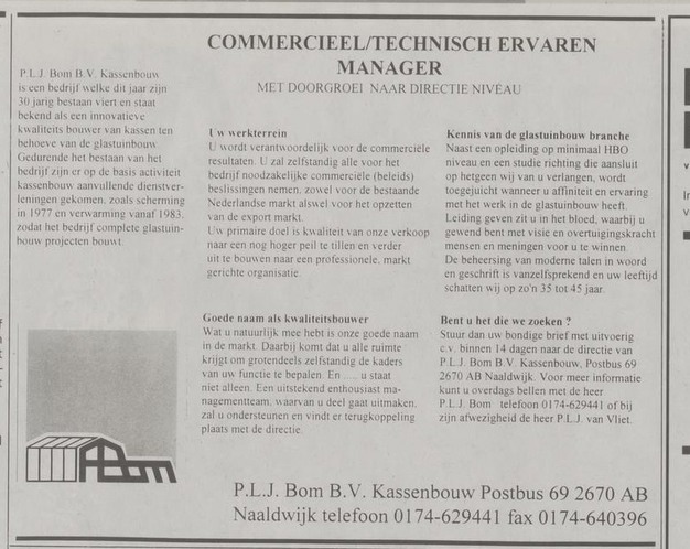 PLJ Bom B.V. Kassenbouw is een bedrijf dat dit jaar zijn 30-jarig bestaan viert en staat bekend als een innovatieve kwaliteitsbouwer van kassen ten behoeve van de glastuinbouw.