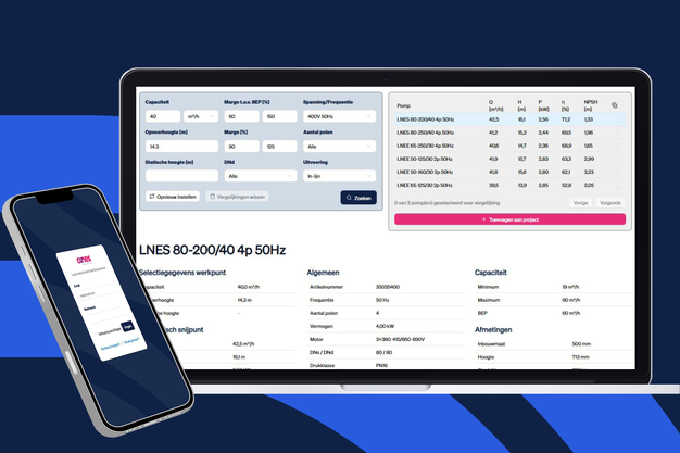 De vernieuwde Curves tool ondersteunt gebruikers bij het volledige selectieproces, van eerste berekening tot offerteaanvraag. Op basis van het gewenste werkpunt, waaronder capaciteit, opvoerhoogte, spanning en frequentie, genereert de tool automatisch passende pompopties die aansluiten bij de projectvereisten.