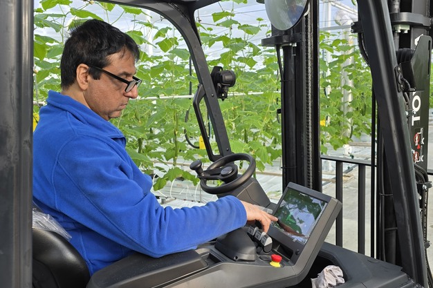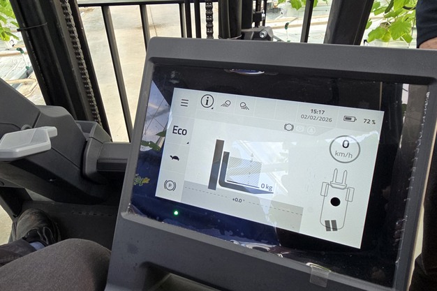 "Hoeveel weegt zo'n pallet vol komkommers?" vraagt Rino aan sorteerchef Farid, die veel op de heftruck rijdt. "850 à 860 kilogram," schat hij. Op het schermpje in de nieuwe heftruck kan hij tijdens het laden het totale laadgewicht goed in de gaten houden. Als het gewicht het maximum overstijgt, dan geeft de heftruck zelf bovendien nog een waarschuwingsgeluid.