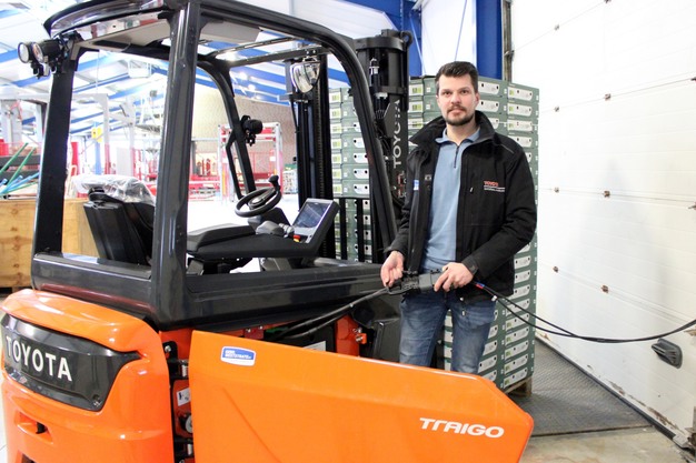 Anton Weststrate laat zien hoe het opladen van de heftruck werkt
