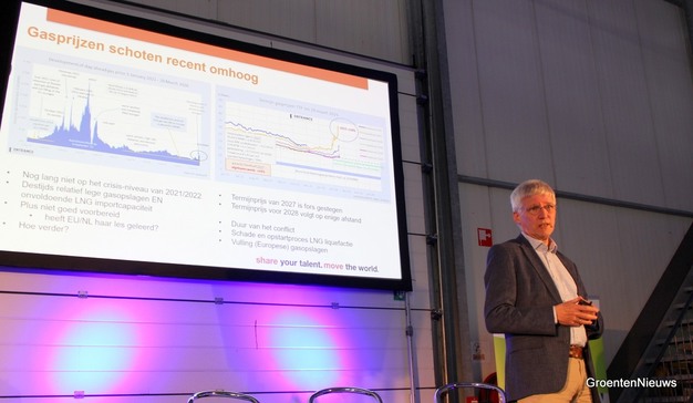 De emeritus-lector van Hanzehogeschool Groningen sprak dinsdagmiddag over de huidige energiemarktontwikkelingen. Hij nuanceerde geluiden dat sluiting van de Straat van Hormuz tot een energiecrisis leidt. Wereldwijd gaat slechts 3% van de mondiale gasvraag door de zeestraat. Voor olie is dat 20%. Daardoor dreigt eerder een oliecrisis dan een gascrisis, en zien we vooral aan de pomp de kosten voor brandstof hard stijgen, terwijl de gasprijsstijging vooralsnog binnen de perken blijft, in vergelijking met de energiecrisis van 2021/2022.