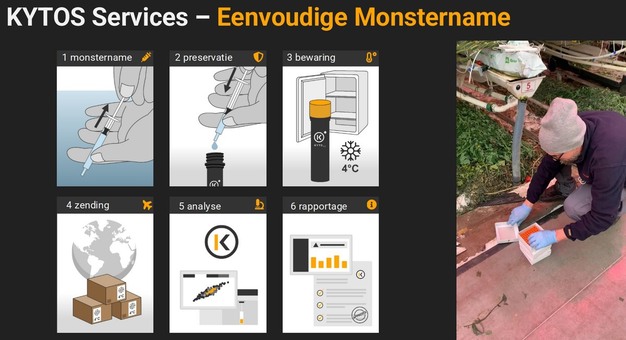 Telers die op zoek zijn naar meer zekerheid kunnen door Kytos metingen laten doen. Zij krijgen hiervoor een KytoVial bemonsterings- en analysepakket opgestuurd. Daarmee kan de teler zelf monsters nemen, die de teler in een door Kytos zelf ontwikkeld vialtje met fixatief stopt. Op die manier kan een monster veilig naar het laboratorium verzonden worden. Kytos doet dat momenteel al voor klanten in België, Nederland, Duitsland en Frankrijk, en is daarnaast al in de aquacultuursector actief, met onder meer lokale servicelabs in Azië. "De klant stuurt ons het monster toe en wij kunnen daarna na ontvangst diezelfde dag nog data leveren, die we voor de klant toegankelijk in de cloud kunnen zetten."