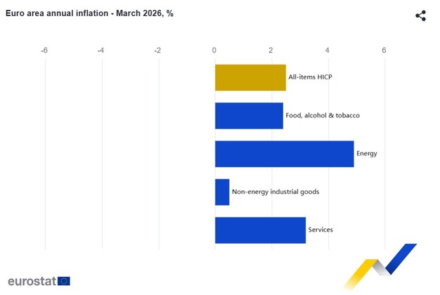 De inflatie in de eurozone is in maart 2026 naar verwachting opgelopen tot 2,5 procent, tegen 1,9 procent in februari, volgens een snelle raming van Eurostat, het statistiekbureau van de Europese Unie.