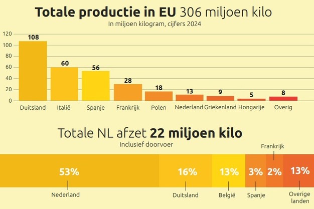 Binnen Europa bedraagt de totale aspergeproductie circa 306 miljoen kilo. Duitsland is de grootste producent, terwijl Nederland zich onderscheidt met een sterke positie in de afzet en handel van asperges.