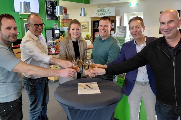 De feestelijke ondertekening met v.l.n.r. Andre Burger (ETB Kuyvenhoven), Erik de Boo (De Boo Bouwtoezicht), Lenny Dijkshoorn (vzt Westlands Museum), Danny Voermans (Nivo Bouw), Gustaaf van Gaalen (bedrijfsvoerder Westlands Museum) en Thomas Collignon (Verkade Klimaat)