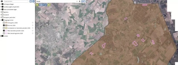 Bij Meloidogyne is er niet alleen de vaststelling van besmette en/of verdachte percelen, maar is er ook een bewakingsgebied afgebakend. Dit bewakingsgebied zijn de deelgemeenten waarin de betrokken aaltjes werden vastgesteld. In dit bewakingsgebied zijn er bijkomende maatregelen, zowel voor de teelt van gecertificeerd als van hoevepootgoed. Zowel de besmette percelen als het bewakingsgebied voor Meloidogyne kan je terugvinden in de kaartlaag plaagorganismen in de verzamelaanvraag. In 2027 zal ook een kaartlaag toegevoegd worden met de percelen met Globodera spp. besmetting (aardappelcystenaaltjes).