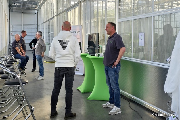 Thomas de Leijer, Lennart Simonse en Jürgen Brokelman van HortiPro praten nog even na met enkele telers.