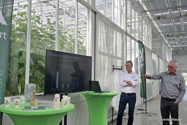 Koppert presenteerde een nieuw biologisch middel tegen onder andere echte meeldauw in komkommer. In kwartaal 3 van 2026 wordt een toelating voor de breedwerkende bio-fungicide verwacht voor komkommer, tomaat en aubergine, vertelden Gerard Buitelaar en Roger Boer. De Koppert-specialisten gaven uitleg over de proefopzet, onderzoeksresultaten en de herkomst van het nieuwe product, waarvan de grondstof in thermale bronnen rond Aix-les-Bains gevonden is.