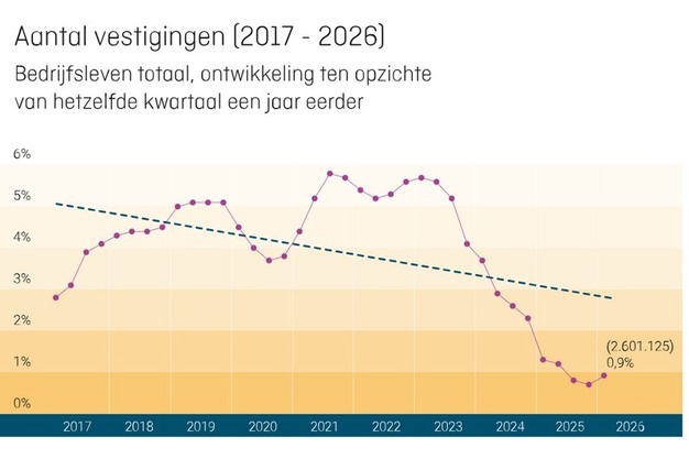 In het eerste kwartaal van 2026 is het aantal startende vestigingen (hierna genoemd 'starters') gestegen en daalde het aantal stoppende vestigingen (hierna genoemd 'stoppers'). Ook het aantal faillissementen nam af. Het aantal vestigingen dat staat ingeschreven in het Handelsregister van de Kamer van Koophandel (KVK) was op 31 maart 2026 2.601.125. Dat is een stijging van 0,9% ten opzichte van het eerste kwartaal van 2025.