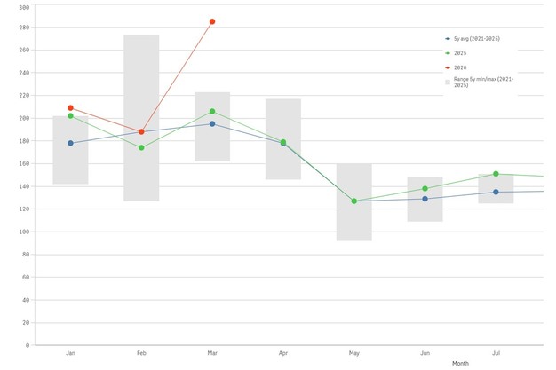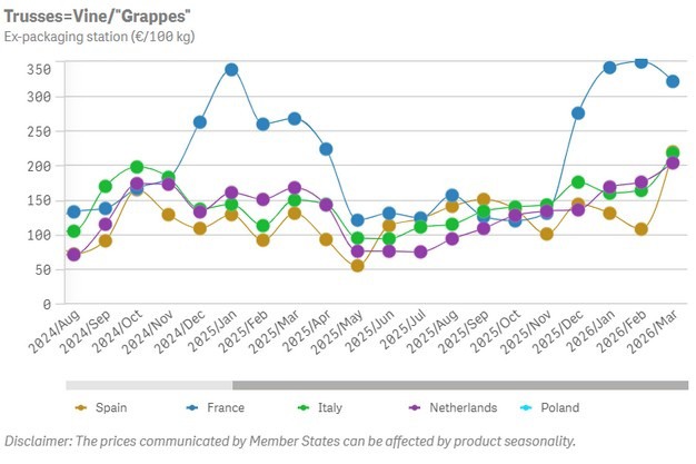 In vergelijking met het vijfjarig gemiddelde lagen prijzen in maart 8 tot zelfs 75 procent hoger. Alleen de prijs van losse, ronde tomaten in Nederland wijkt hier af. Die ligt 22 procent lager dan het vijfjarig gemiddelde met een kiloprijs van 1,10 euro. De prijs blijft ook 17 procent achter bij 2025 volgens de EU-statistici.