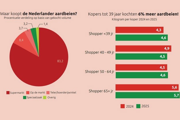 De Nederlandse aardbeienmarkt zit in de lift. Nederlanders tot 39 jaar kochten in 2025 6% meer aardbeien dan een jaar eerder. Tegelijkertijd groeide de totale aardbeienproductie in Nederland door naar 91 miljoen kilo. Dit en meer is te vinden in de factsheet aardbei van GroentenFruit Huis.