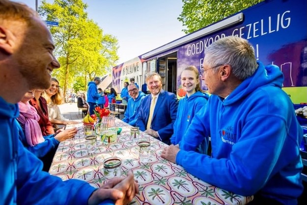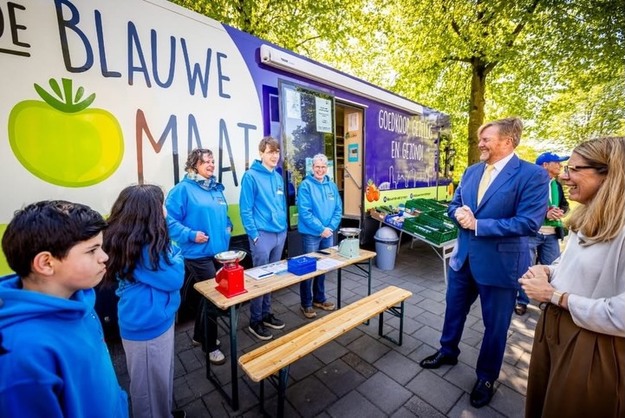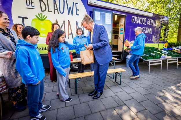 Tholen - Het was een bijzondere koffiepauze voor de vrijwilligers en klanten van De Blauwe Tomaat. Koning Willem-Alexander bracht afgelopen donderdag een werkbezoek aan de mobiele groentewinkel De Blauwe Tomaat, waar hij plaatsnam op het bekende terrasje met gratis koffie en thee. De koning, die beschermheer is van het Oranje Fonds, liet zich informeren over hoe deze rijdende SRV-wagen AGF betaalbaar maakt en buurtgenoten met elkaar verbindt.