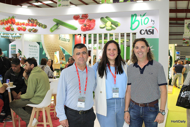 Daniel Correa, Paco Fernández en Javier Fernández op de stand van Grupo Tecniagro, waarvan het dak was gemaakt van de lichtselectieve netten van het bedrijf