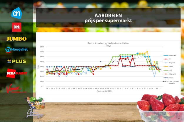 Aardbeien© Supermarktscanner De gemiddelde aardbeienprijs daalt spectaculair met 90 cent naar 3,09 euro per 400 gram. Bijna alle supermarkten voeren zeer scherpe aardbeienaanbiedingen die rond de 3 euro liggen, de laagste prijs van het jaar tot nu toe. Albert Heijn verlaagt met 1,00 euro naar 2,99 euro, evenals Hoogvliet. Jumbo verlaagt met 49 cent naar 3,00 euro en Plus met 2,00 euro naar 2,99 euro. DekaMarkt blijft stabiel op 3,49 euro. Vomar en Dirk ontbreken in de data, deze voeren online niet de 400 gram-variant van aardbeien