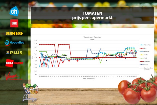 Prijsdata zijn afkomstig van Supermarktscanner.nl en gebaseerd op de online prijzen in de webwinkels van Albert Heijn, Jumbo, Plus, DekaMarkt, Dirk en Hoogvliet. De prijs is een gemiddelde, inclusief de promoties. In deze prijsvergelijking zijn herkomst en kwaliteit niet meegenomen. De meeste supermarkten vermelden deze gegevens niet op hun website. Jumbo verkoopt alleen verpakte trostomaten per 5 stuks in plaats van per 500 g of kilo.