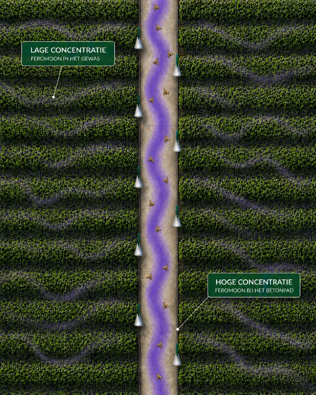 "Een belangrijk inzicht uit eerdere proeven met verwarringsferomonen was dat de meeste motten sowieso al in vallen nabij het betonpad werden gevangen. Door hierop door te bouwen en het aantal vallen langs het pad te verhogen, is de monitoring verder geoptimaliseerd. In veel situaties blijkt het daardoor niet meer nodig om nog vallen in het gewas op te hangen."