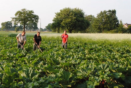 De werkzaamheden bestaan dagelijks uit oogsten en het onderhouden van het gewas. Dit betekent voornaamlijk onkruid verwijderen, met warm weer beregenen en de percelen bemesten. "Rabarber is een plant zonder echte vijanden, het gevaar zit 'm vooral in het onkruid", legt Anton uit. "Wij gebruiken geen chemische gewasbeschermingsmiddelen. Dat betekent dus mechanisch met een frees en ouderwets met de schoffel aan de slag. Tijdens de eerste teelt is het geen probleem: de rabarber is eerder dan het onkruid. Maar nu wordt het wel wat meer werk." De rabarberplanten, ras Frambozenrood, zijn jaren geleden van een Limburgse plantenkweker gehaald. "Frambozenrood geeft wel wat minder opbrengst, maar de kleur is in het voorjaar altijd mooi diep rood." Eén plant gaat zes tot zeven jaar mee en elk jaar wordt er met de beste planten gestekt voor het aanleggen van nieuwe percelen.