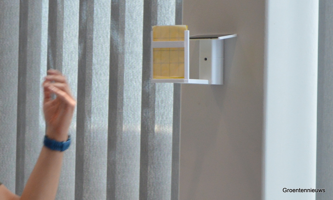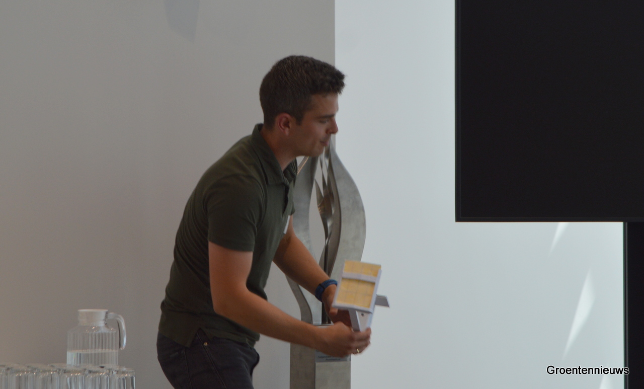 Naast een drone had Bram ook een Trap Eye meegenomen, een nieuwe automatiseringsinnovatie die de vangst op een vangplaat digitaal monitort. Op die manier hoeft de mens niet meer alle vangplaten in de kas af. De innovatie is plug en play. Uitgedaagd door de zaal deed Bram net of hij de tool aan de door Prominent in 2020 gewonnen Tuinbouw Ondernemersprijs ging bevestigen.