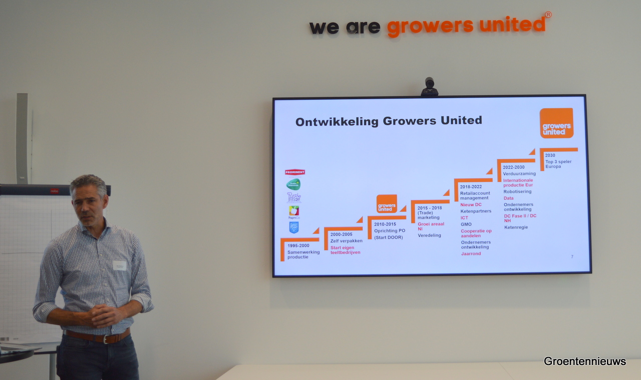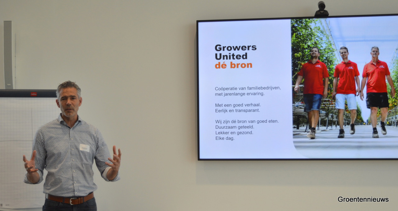 Jan Opschoor vertelde als Algemeen Directeur het verhaal over het ontstaan van Growers United. Met een knipoog naar de presentatie van Bram gaf hij aan dat de coöperatie ‘geen startup meer is’, maar nog altijd relatief jong, namelijk opgericht in 2013.