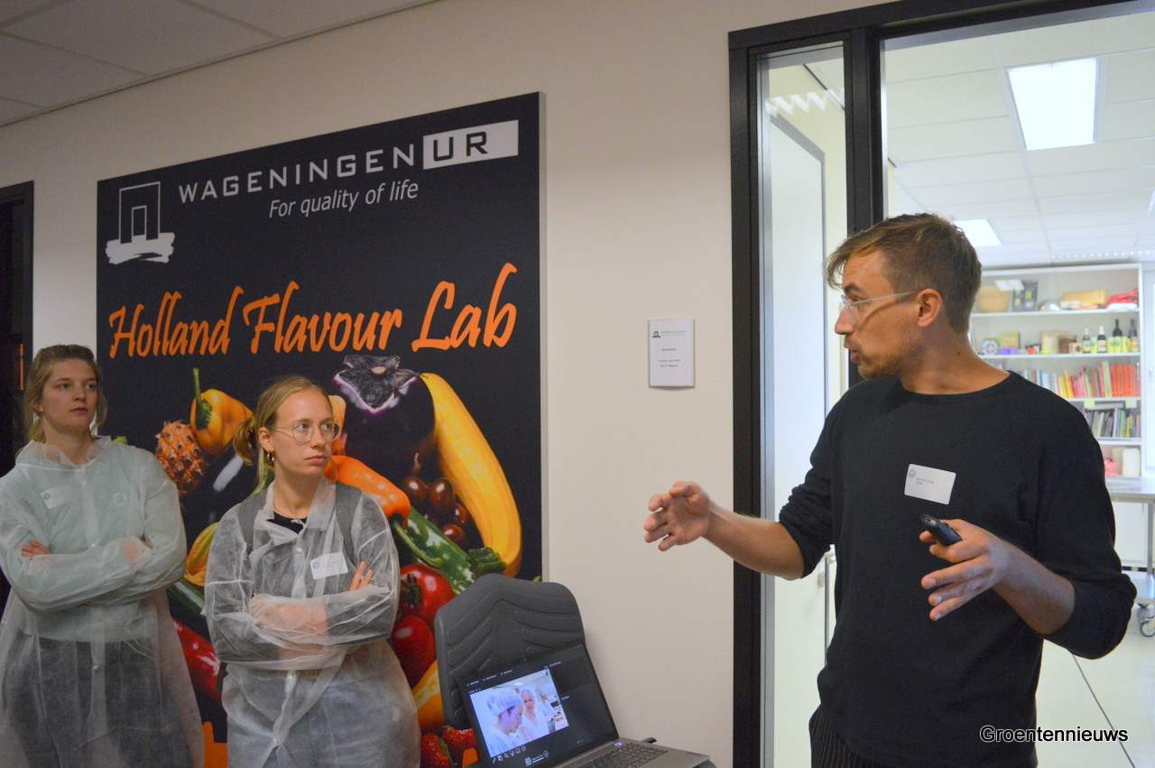 Rick de Jong van de WUR gaf uitleg over wat ze in het Flavour Lab doen. In het kort: het ontwikkelen van een handheld sensortool om non-destructief kwaliteitsmetingen te doen bij tomaten. Lotte en Caterina van Source.ag luisteren aandachtig.