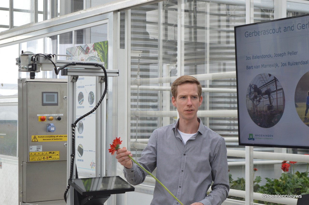 Jos Ruizendaal van de WUR gaf een presentatie over automatisering in de gerberateelt voor zowel monitoring als oogsten. Op dit moment is de WUR samen met een machinebouwer bezig om met de robot richting commercialisatie toe te werken.