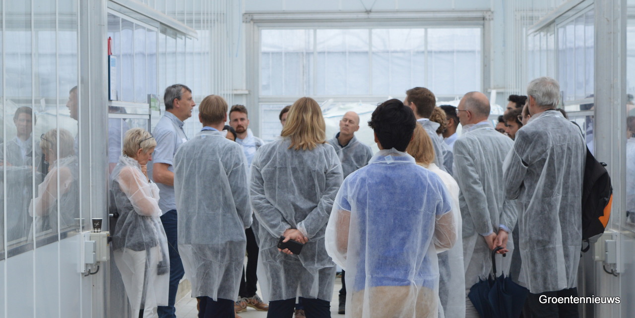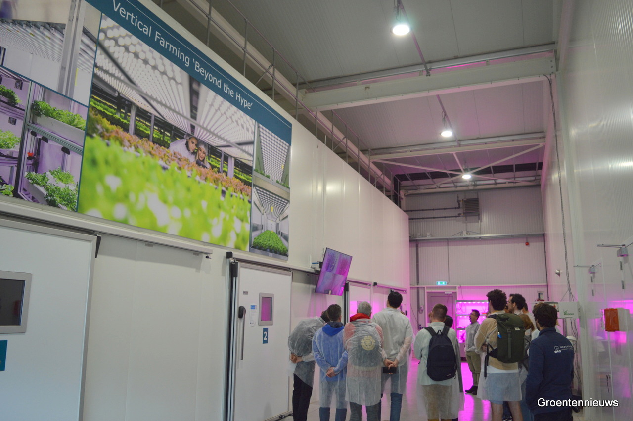 In de vorig jaar geopende indoor farm konden de groepen tijdens de rondleiding ook een kijkje nemen. Er wordt zoveel geëxperimenteerd met meerlagenteelt als met hogedraadteelt in een klimaatcel.