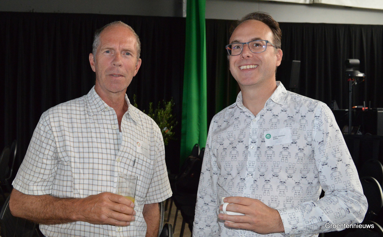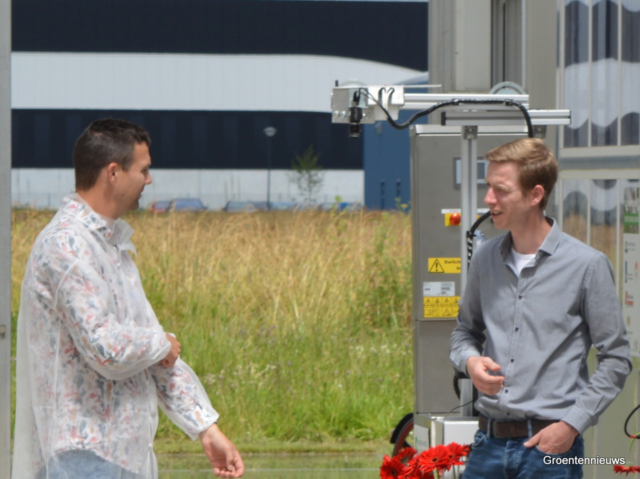 Onderonsje bij de gerbera-oogstrobot tussen tussen Martijn Duijvesteijn (Beyond Chrysant) en Jos Ruizendaal (WUR)