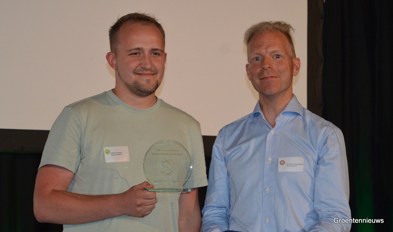 Team VeggieMight werd derde. Nikita Rogovoy (QuantumSoft) en Vincent van der Wijngaard (Horticompass) kwamen de prijs ophalen.