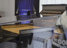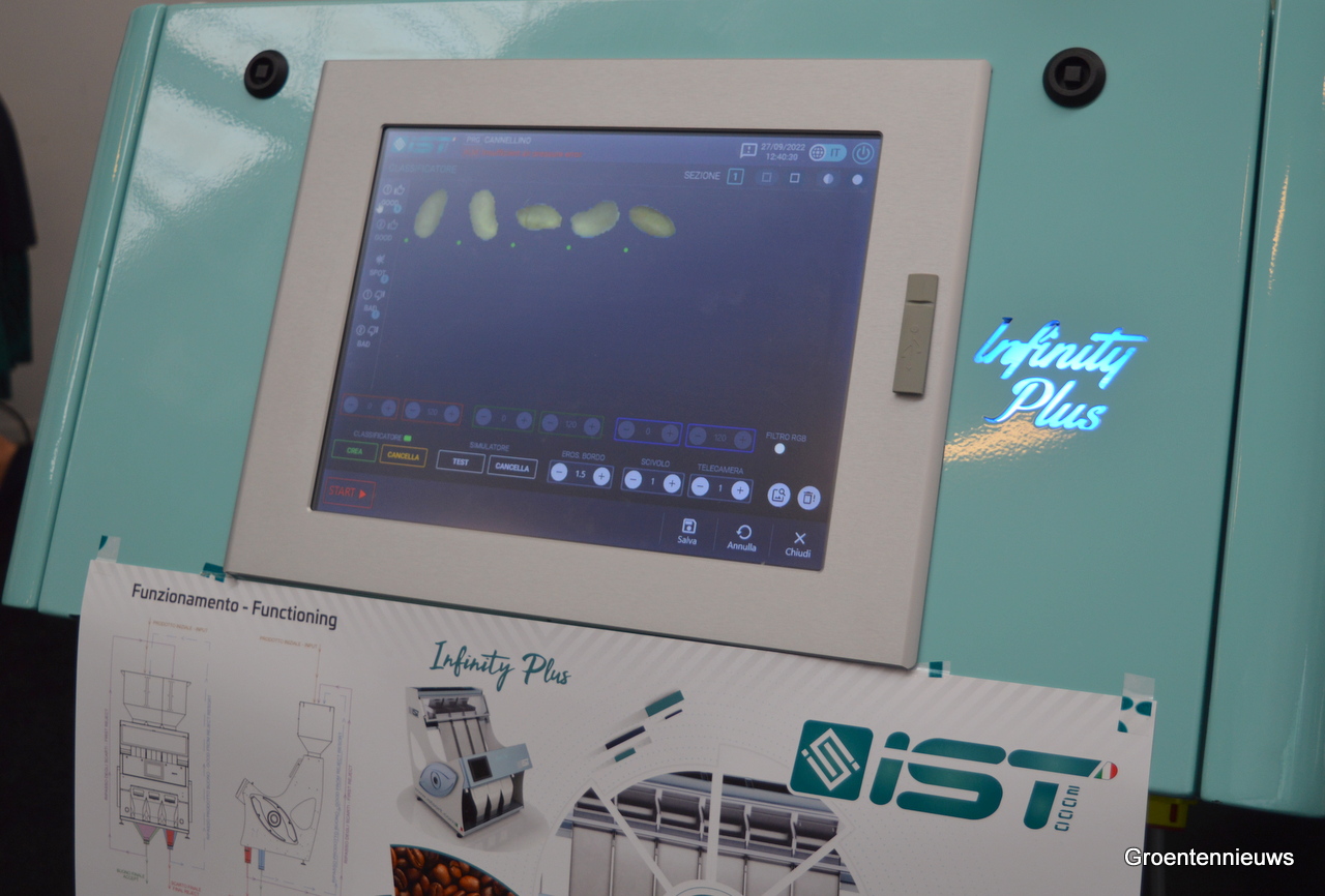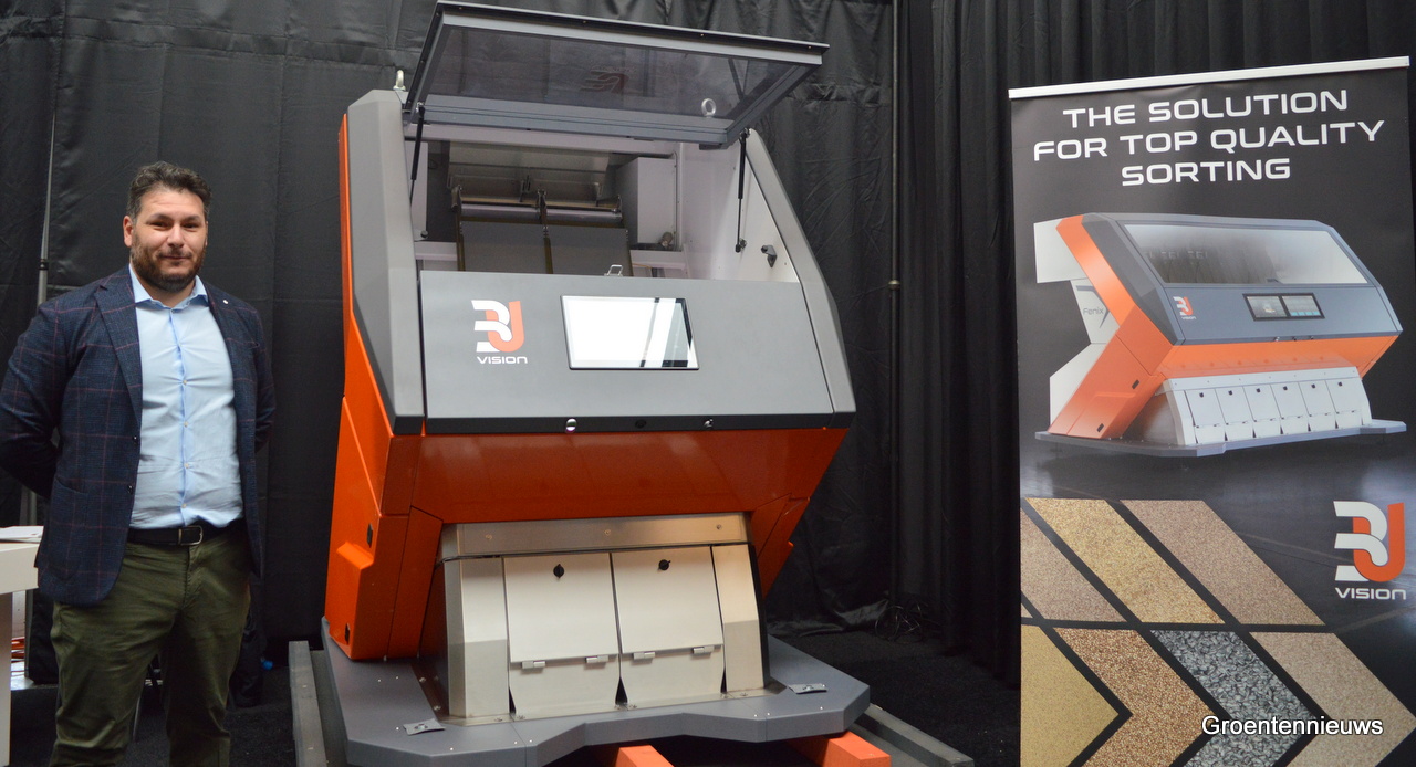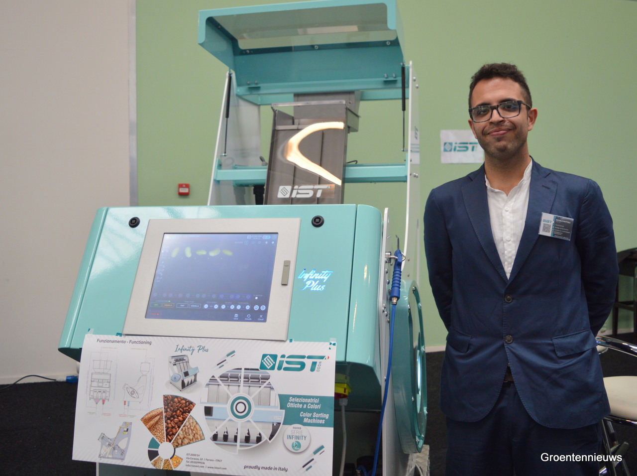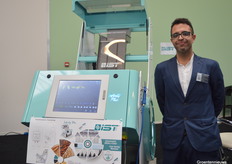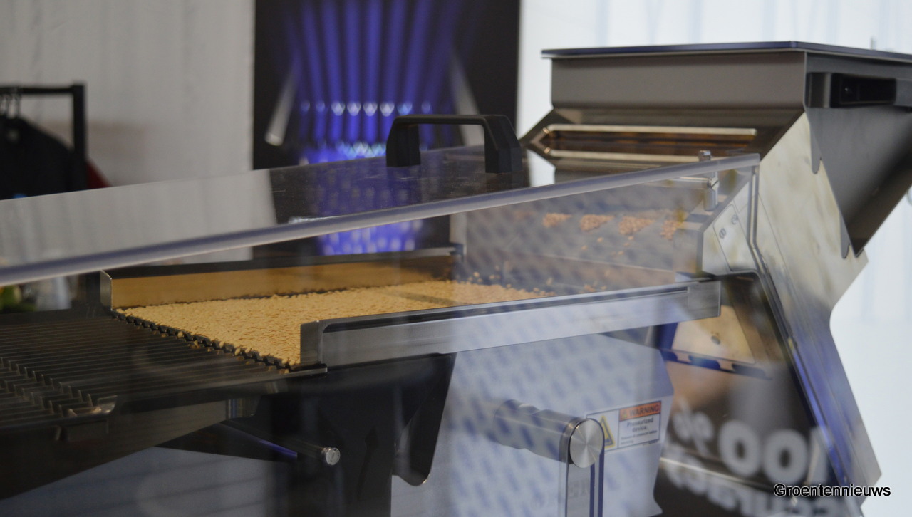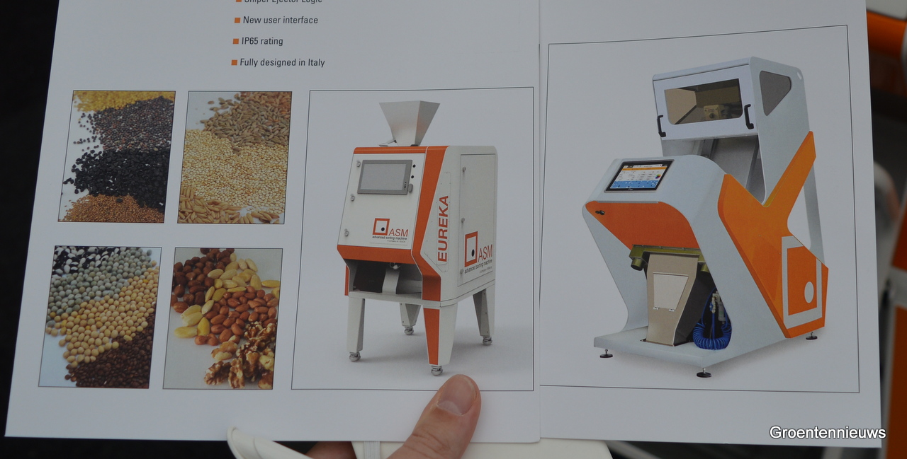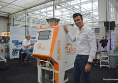 Italiaanse bedrijven waren goed vertegenwoordigd. Hier op de foto: Michele Mattioli IST. Hij bracht een kleursorteermachine mee die tot 1 ton zaden per uur kan verwerken. De machine wordt niet alleen voor zaden gebruikt, maar bijvoorbeeld ook voor koffiebonen demonstreerde Michele.