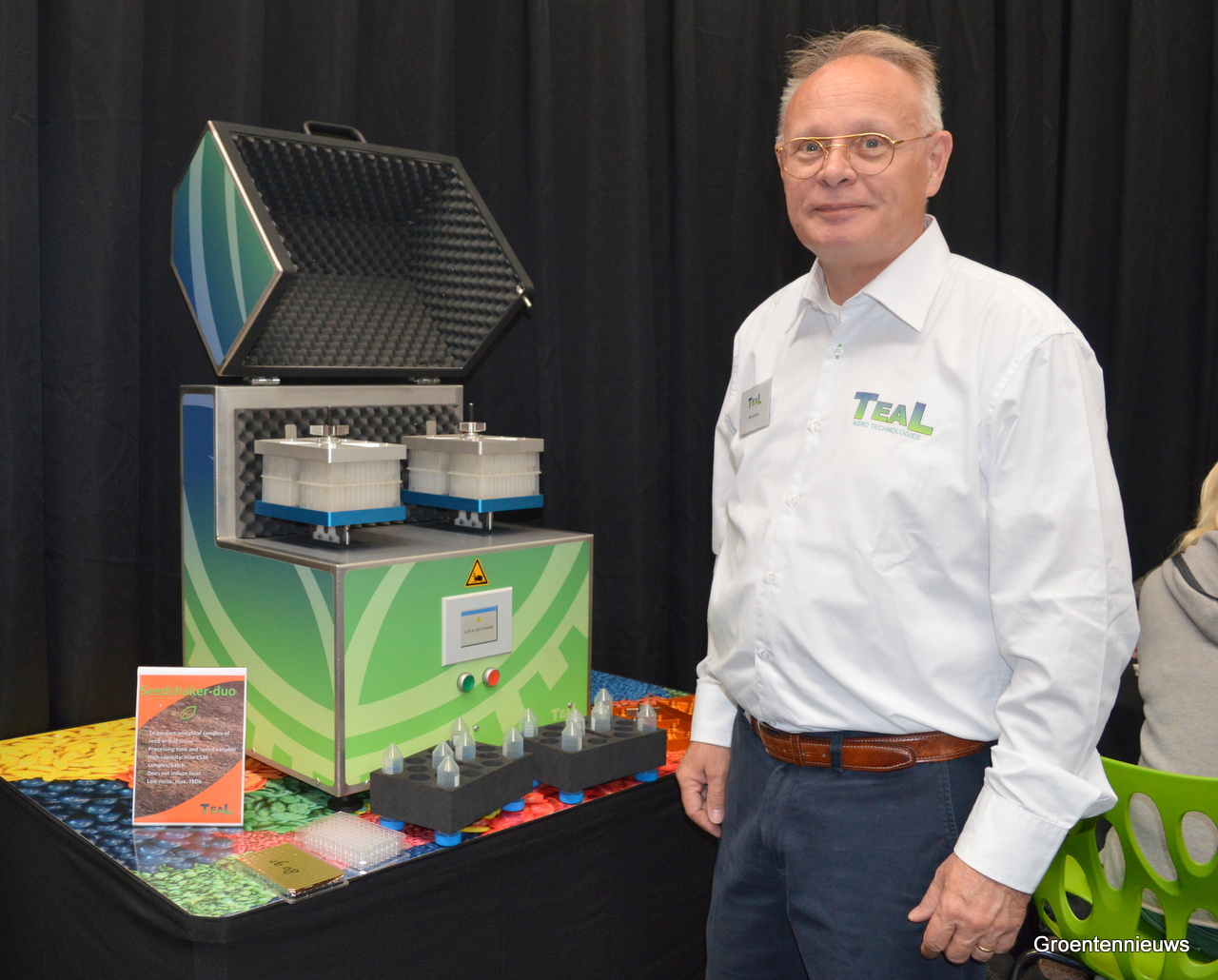 Rob Lesscher van TeaL naast de Seedshaker Duo. De machine is volgens Rob ‘een hit in de markt’ omdat bedrijven op zoek zijn naar een alternatief voor bestaande technieken. Gebruik van de machine levert een arbeidsbesparing op en materiaal om daarna DNA-extractie mee te doen.