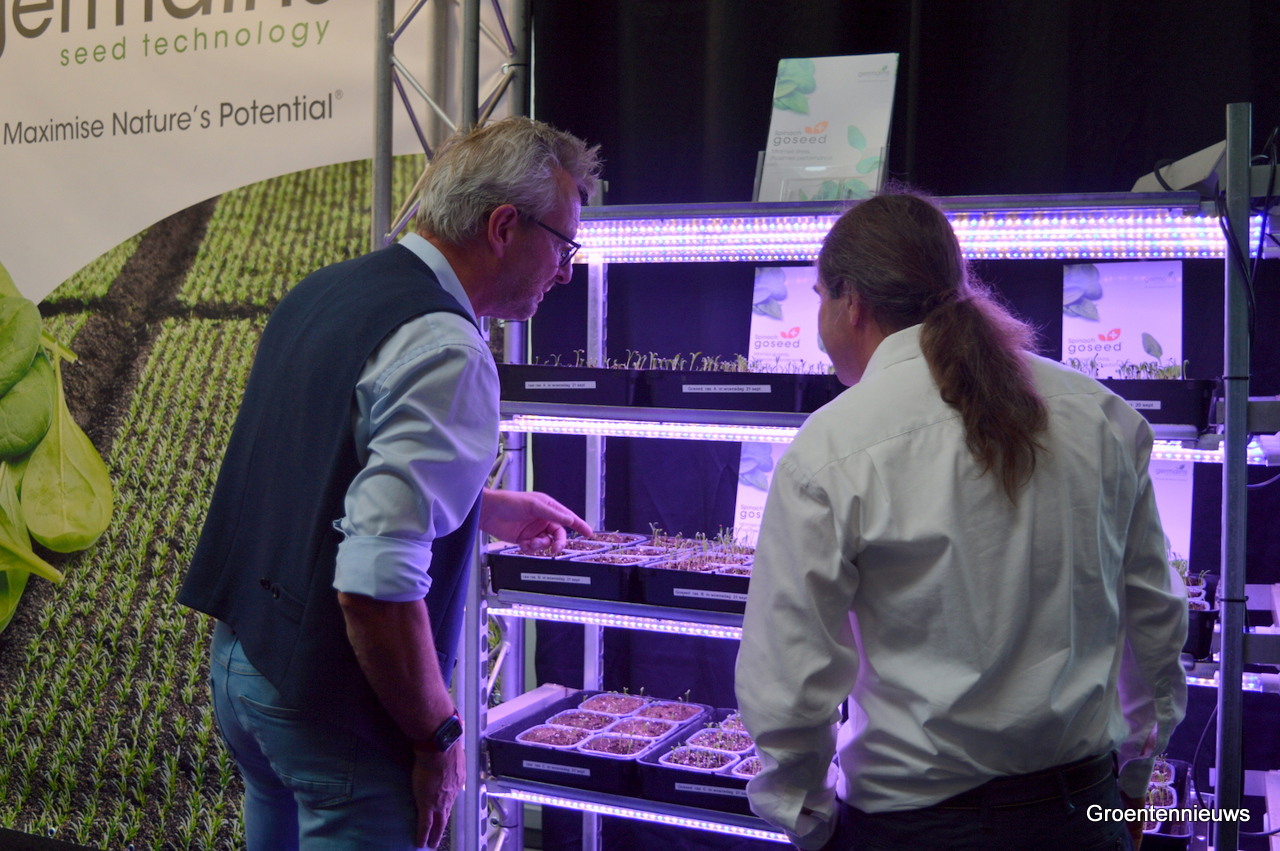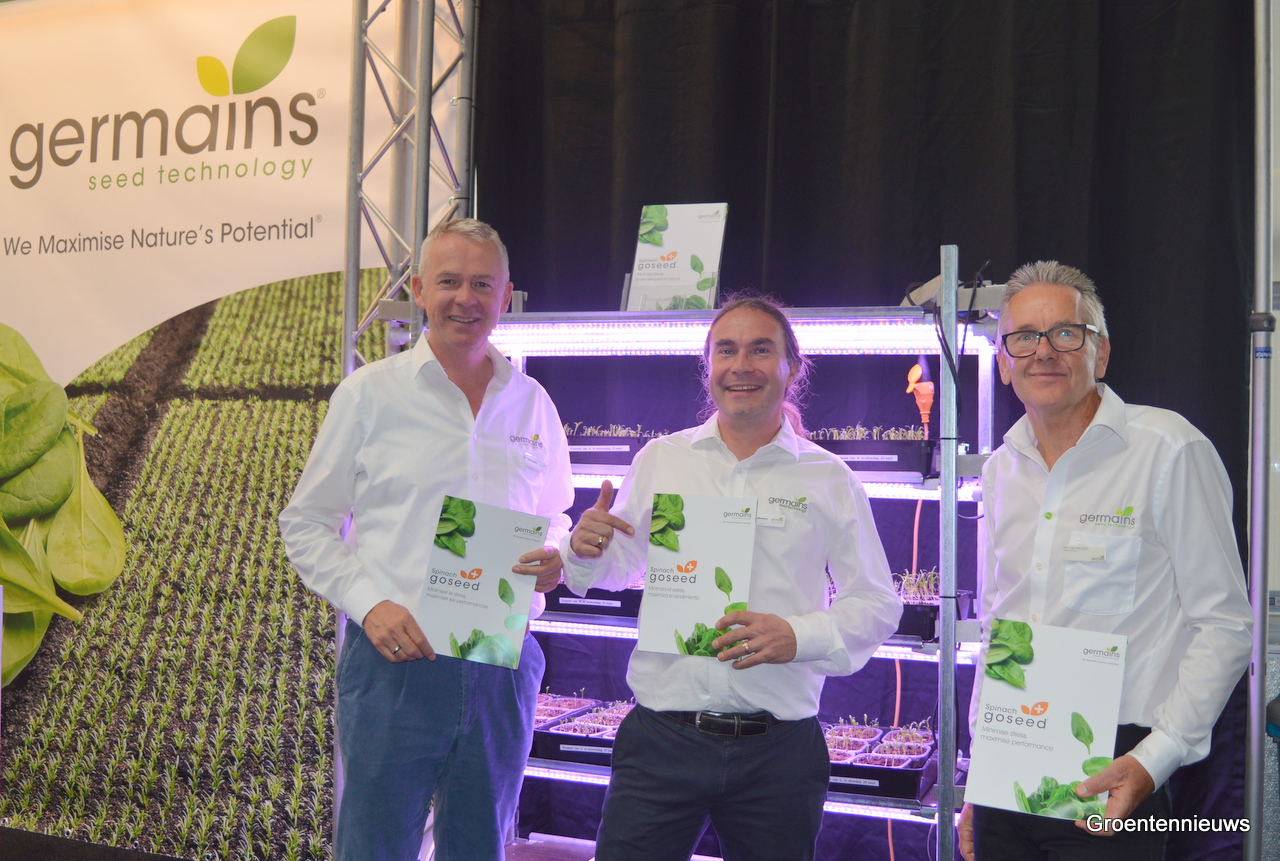 Bart van der Linden, Patrick Butterbach en Eric van der Drift van Germains voor een opstelling waarop de werking van hun nieuwe product Goseed voor spinazie te zien is. Het product wordt aangebracht op zaden en zorgt volgens de mannen voor een betere opkomst, betere plantstand en betere opbrengst.