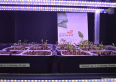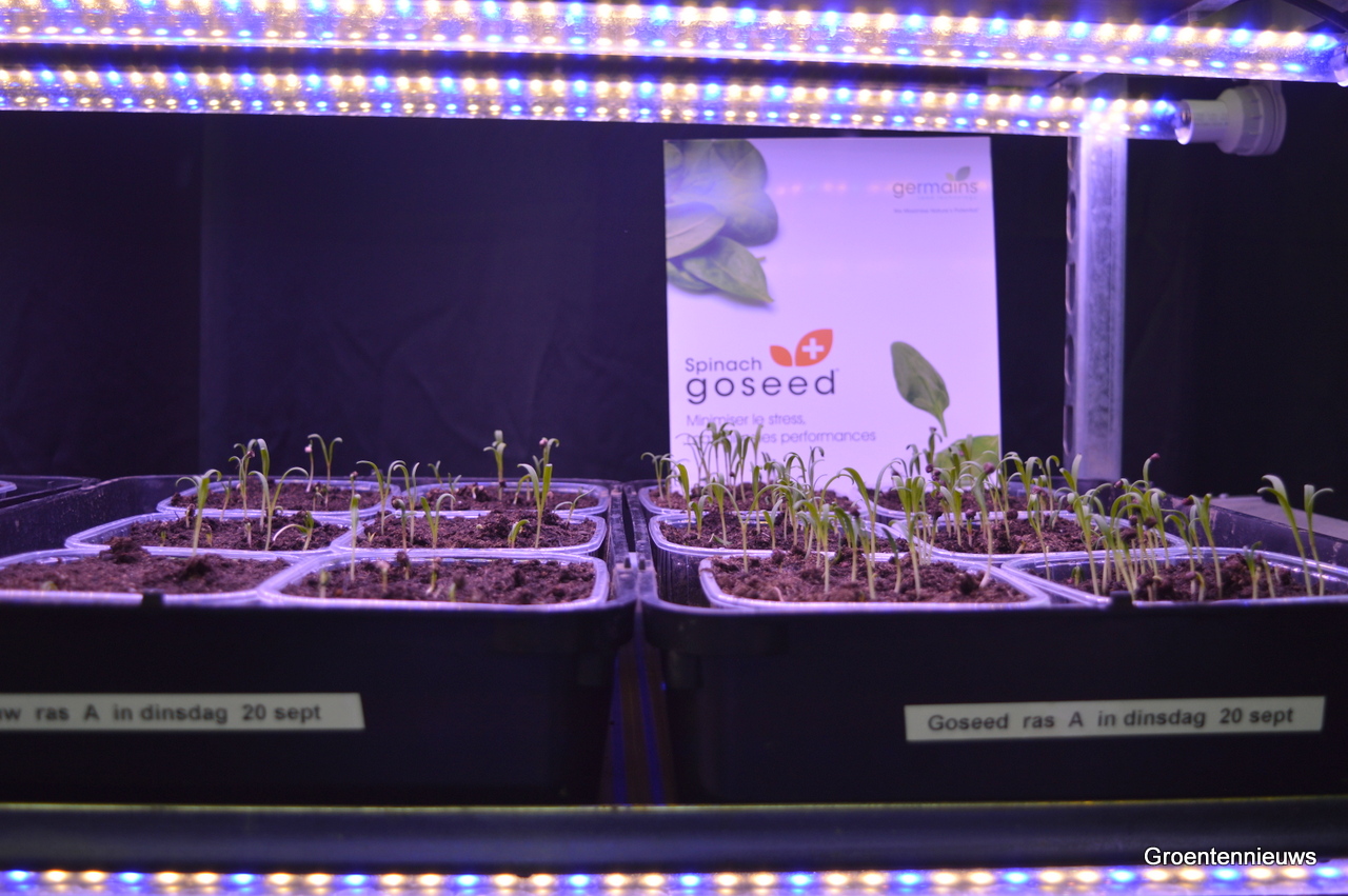 Links de spinazieplantjes uit onbehandelde zaden, rechts de plantjes van met Goseed behandelde spinaziezaden